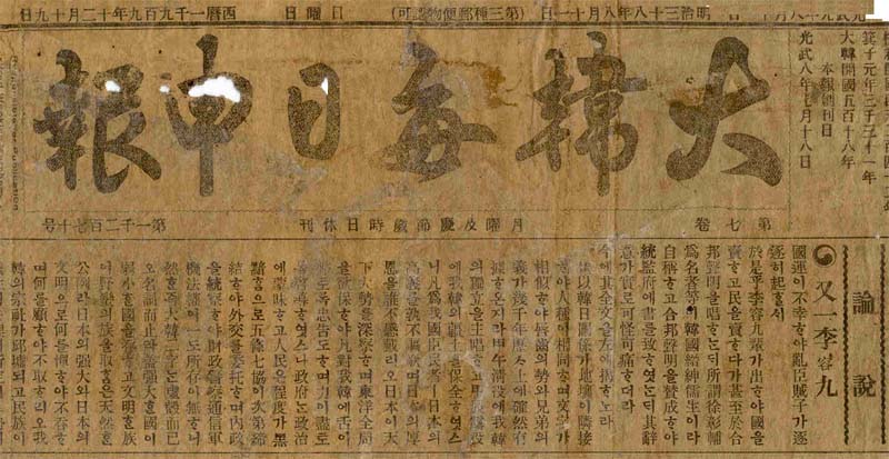 1904³âºÎÅÍ ±¹±ÇÇÇÅ» ¶§±îÁö ¹ß°£µÇ¾ú´ø Àϰ£½Å¹®ÀÌ´Ù. 1904³â 2¿ù¿¡ ÀϾ ³ëÀÏÀüÀï(ÖÚìíîúî³)À» ÃëÀçÇϱâ À§ÇØ Çѱ¹¿¡ ¿Ô´ø ¿µ±¹ÀÎ ¹è¼³(ÛÑàã:Ernest Thomas Bethell)ÀÌ ¾ç±âŹ(ÕÙÑÃ÷¡) µî ¹ÎÁ·Áø¿µ ÀλçµéÀÇ µµ¿òÀ» ¹Þ¾Æ 7¿ù 18ÀÏ¿¡ â°£ÇÏ¿´´Ù.   ¡¶´ëÇѸÅÀϽꏡ·°¡ â°£µÇ´ø ¹«·ÆÀº ÀϺ»ÃøÀÌ Çѱ¹ ¾ð·Ð¿¡ ´ë ...