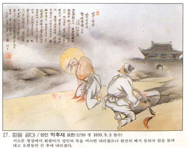 | Çѱ¹ õÁÖ±³È¸ÀÇ 103¸íÀÇ ¼ºÀÎÁß ÇÑ»ç¶÷.¡®¸í°ü¡¯À¸·Îµµ ºÒ¸®´ø ¹ÚÈÄÀç´Â °æ±âµµ ¿ëÀÎ Áö¹æ ±³¿ì °¡Á¤¿¡¼ ž´Ù. 1801³â ½ÅÀ¯¹ÚÇØ·Î ¾Æ¹öÁö¸¦ ¿©ÀÈ µÚ Ȧ¾î¸Ó´Ï ¹Ø¿¡¼ ÀÚ¶ú´Ù. ¼ºÀåÇÏ¸é¼ ¹°Àå»ç¸¦ ÇÏ´Â ³ë¸ð¸¦ µµ¿Í ¤½Å°ú ¹ÌÅõ¸®¸¦ ÆÈ¾Æ »ýȰÇÏ¿´°í, 36¼¼ ¶§ ±³¿ì ó³à¿Í °áÈ¥ÇÏ¿´´Ù. 1839³â 5¿ù ¾Æ³»¸¦ ÇǽŽÃ۰í ...